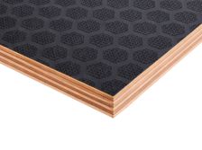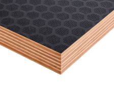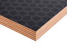 Листы изготавливают из березового шпона, склеенного фенолформальдегидным клеем, с нанесением ламинирующей пленки и сетчатого покрытия на одну или обе стороны. Сетчатая поверхность обеспечивает противоскользящий эффект, что делает материал идеальным для полов и платформ. Фанера устойчива к влаге, перепадам температур, механическим нагрузкам. Береза придает высокую прочность, а ламинирующая пленка защищает от воды, химикатов, истирания. Толщина листов — от 6 до 40 мм, стандартные размеры — 1220х2440 мм или 1500х3000 мм. Материал легко режется, но сложнее поддается тонкой обработке из-за покрытия. Экологичность ограничена из-за фенольного клея, поэтому фанеру редко используют в жилых помещениях. Высокая износостойкость и противоскользящие свойства делают ее востребованной в транспорте и строительстве.